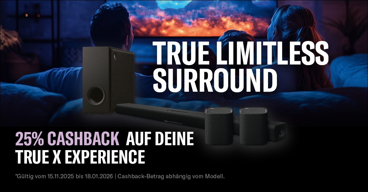 Erleben Sie umhüllendes, kabelloses Surround-Sound, das sich an Ihr Wohnzimmer anpasst. Yamaha TRUE X kombiniert eine leistungsstarke Soundbar mit flexiblen Surround-Lautsprechern, um Sie mitten ins Geschehen zu versetzen – ganz ohne komplizierte Setups. Für eine begrenzte Zeit können Sie beim Kauf einer berechtigten Yamaha TRUE X Soundbar 25 % Cashback für Ihr True X Erlebnis beanspruchen.